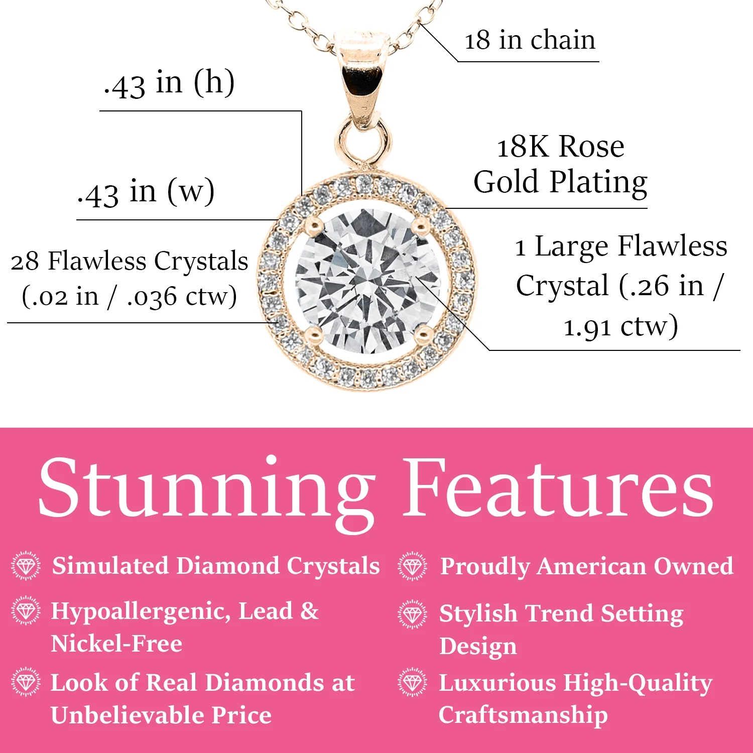 The necklace is crafted from high-quality brass with a luxurious 18K rose gold plating, featuring a dazzling center crystal surrounded by accent crystals.